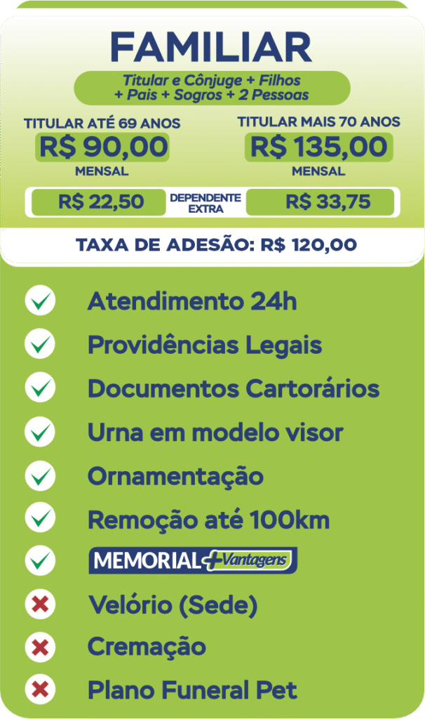 Ainda é possível incluir benefícios extras como cremação humana, tanatopraxia, coroa de flores e outros. Consulte para valores adicionais e carências.